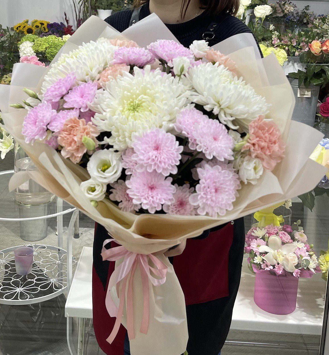 Букет в нежных оттенках прекрасно подойдёт для любого торжества, первого свидания, дня рождения, а так же как подарок молодым в день свадьбы. Ароматные розы, гвоздики в сочетании с кустовой хризантемой будут радовать своей свежестью и красотой