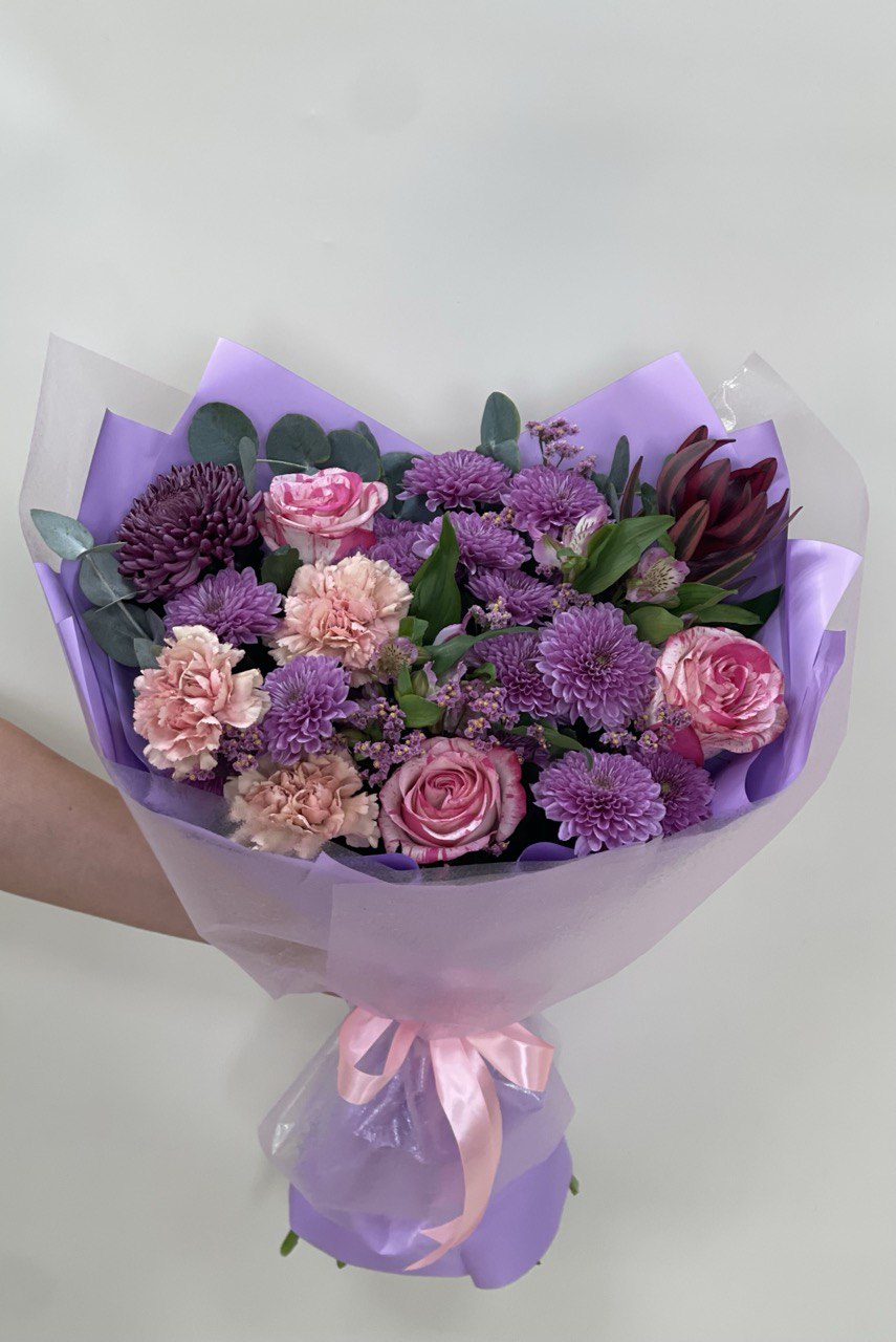 Этот изысканный букет — воплощение нежности и утонченности. Нежные розовые розы, гармонично сочетаются с насыщенными фиолетовыми хризантемами, которые добавляют глубины и элегантности. Персиковые гвоздики придают композиции теплоту и мягкость, а веточки эвкалипта добавляют особый аромат букету. Букет идеально подойдет для выражения самых теплых чувств — будь то признание в любви, поздравление с праздником или просто желание порадовать близкого человека.