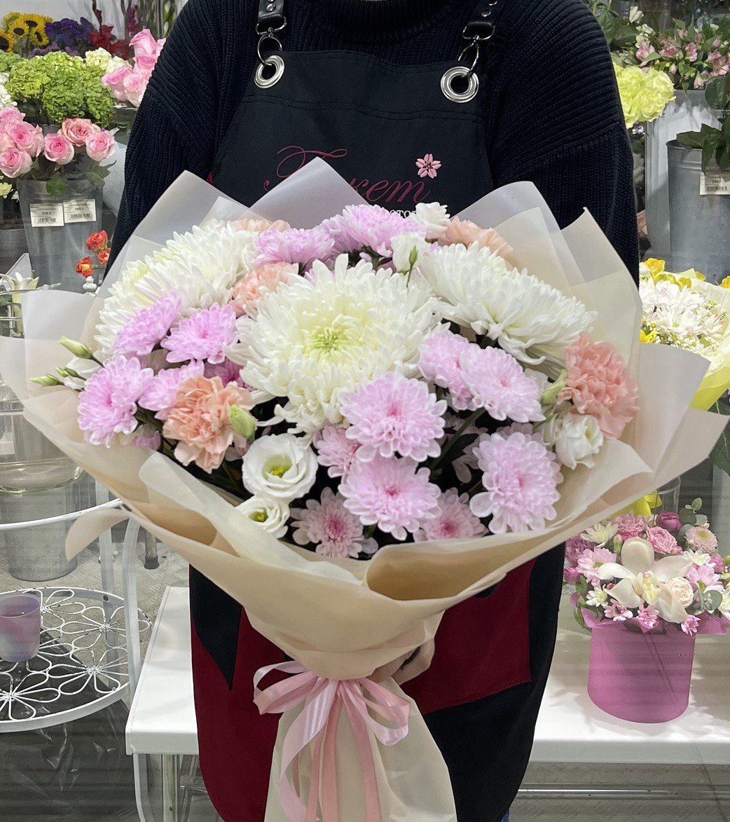 Сочетание нежности и элегантности. В составе: розы, кустовые хризантемы, альстромерии. Такой букет будет идеален для дарения на разные поводы: день рождения, юбилей, маме, бабушке, учителю, коллеге или просто как знак внимания и заботы. Его можно оформить в нежной цветовой гамме, что сделает композицию ещё более привлекательной.