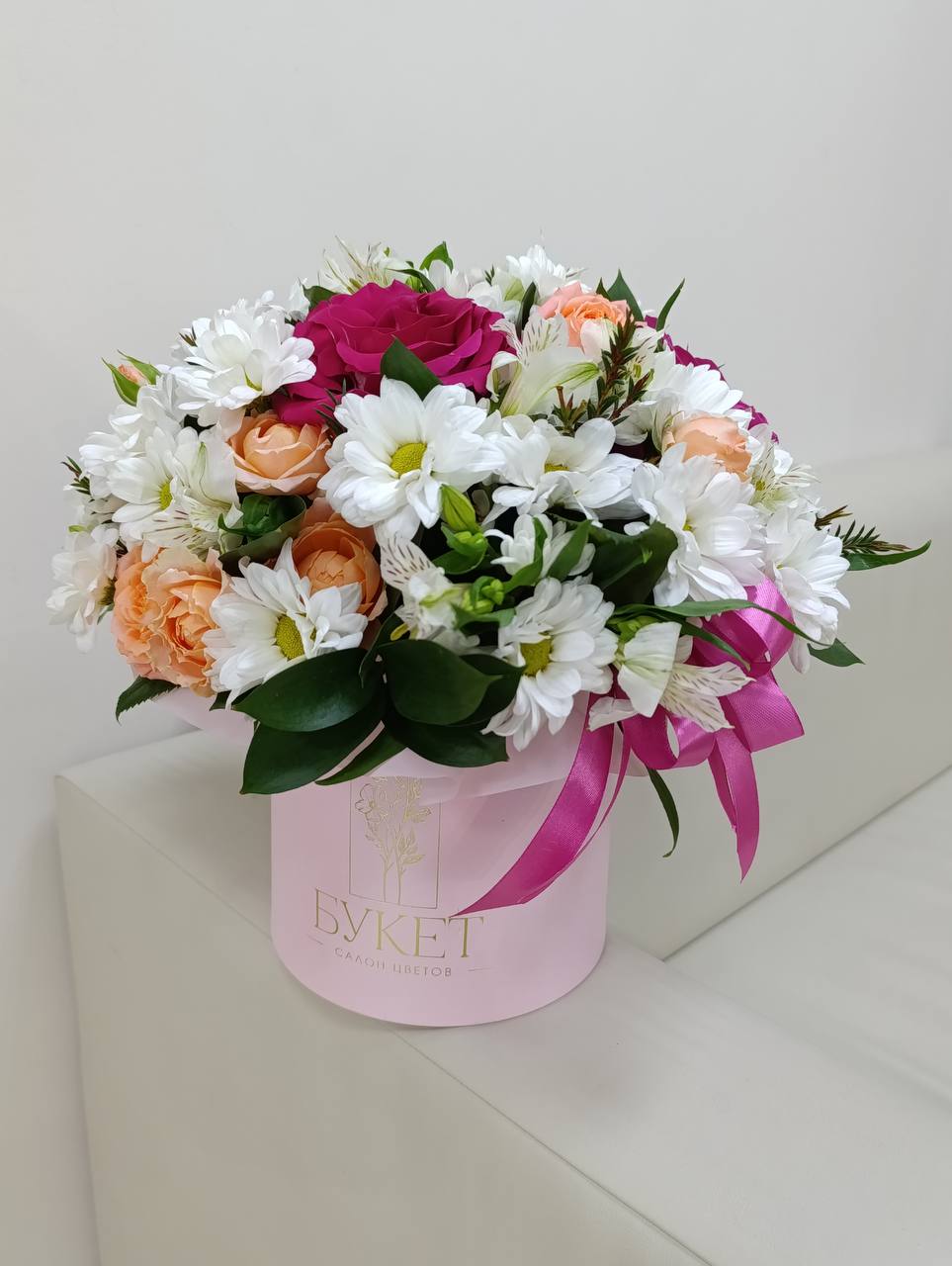 Яркая коробка с цветами — это то, что нужно для хорошего настроения! Подарите красивые пожелания счастья, вместе с ароматными цветами сочных оттенков. Состав: роза, хризантема кустовая, альстромерия, пионы, зелень