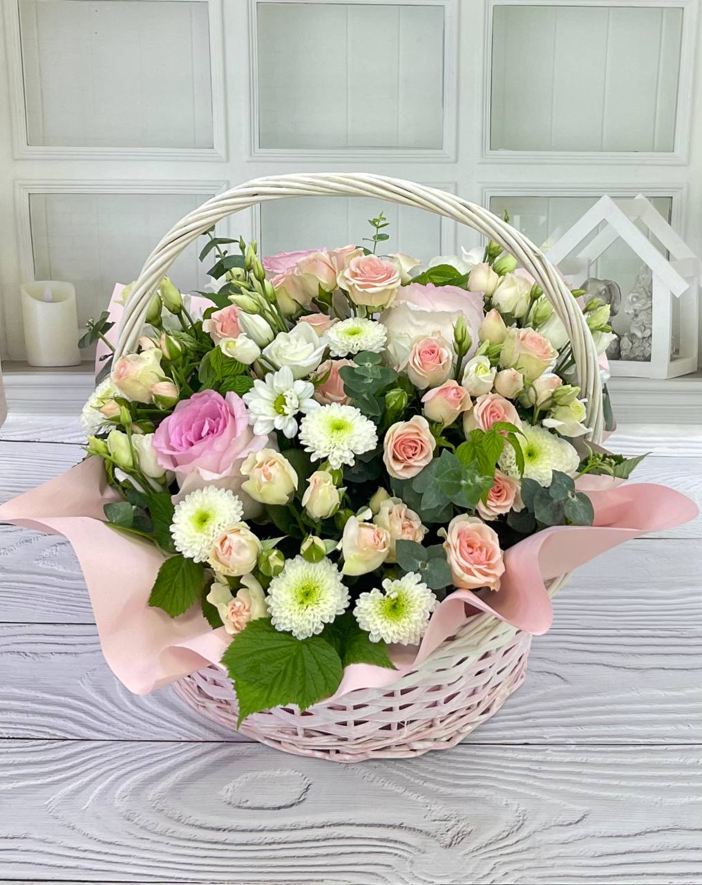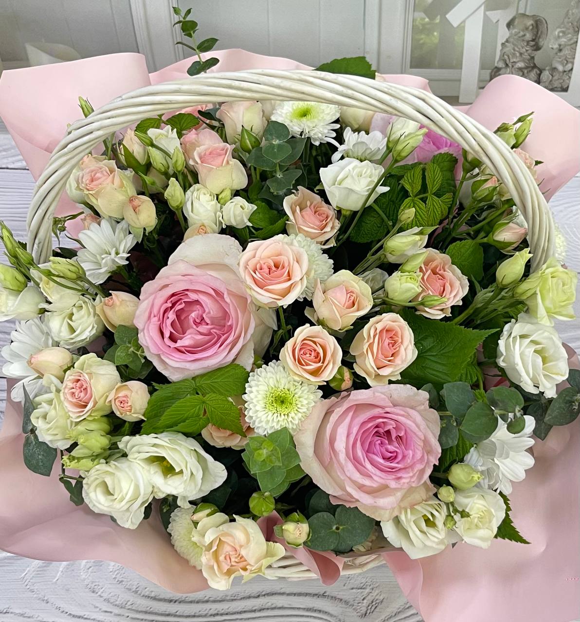 Эта изящная корзина — воплощение нежности и природной красоты. В ней собраны одноголовые и кустовые розы в пастельных тонах и нежная эустома. В сочетании с ветками эвкалипта композиция приобретает легкость и воздушность, наполняя пространство уютом и гармонией. Идеальный подарок или украшение для любого особенного повода, эта корзина подчеркнет вашу заботу и хорошее настроение, создаст атмосферу романтики .