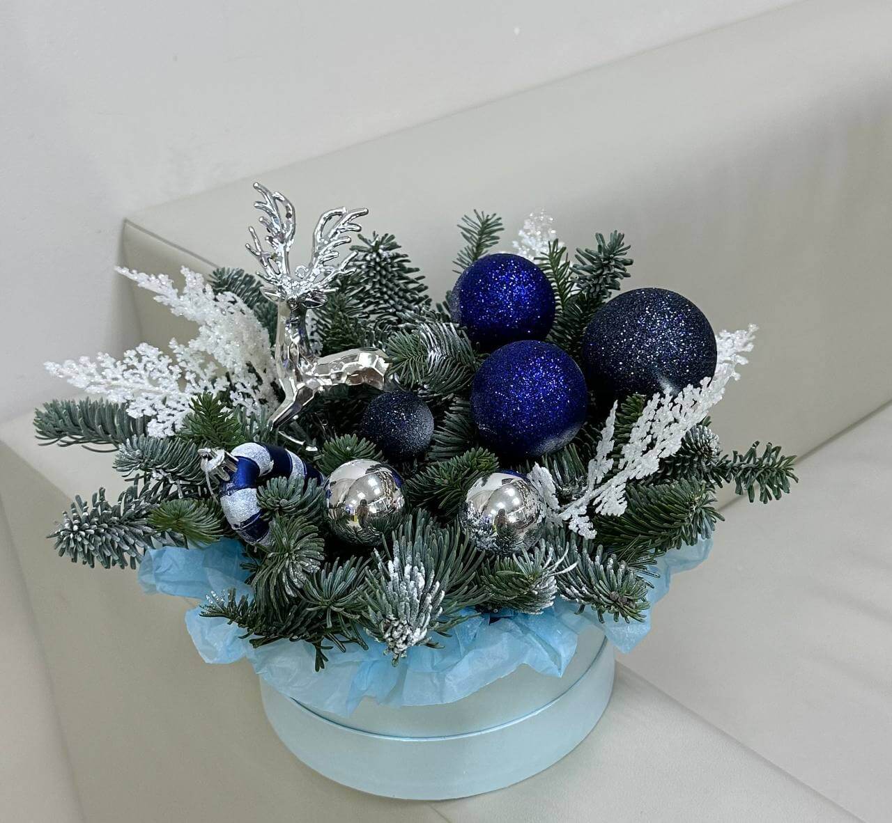 Композиция выполнена в элегантной цветовой гамме — сочетание глубокого, синего, серебристого и нежно-голубого, создаёт ощущение морозного зимнего утра. Веточки натуральной хвои наполнят дом волшебным ароматом праздника и будут радовать свежестью более 2 недель. Такая композиция подойдёт для подарка коллегам, друзьям или близким. Подарите себе и окружающим немного волшебства этой зимой с нашей изысканной новогодней композицией!